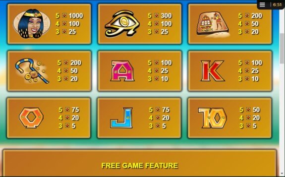 Free spins går också att kamma hem i A While on the Nile som har free spins-symboler på det andra, tredje samt fjärde hjulet. I slotsammanhang är det scattern som triggar igång free spins och i detta fall är det juvelen som representerar denna funktion. När du får tre eller flera juveler är du garanterad fem stycken free spins.