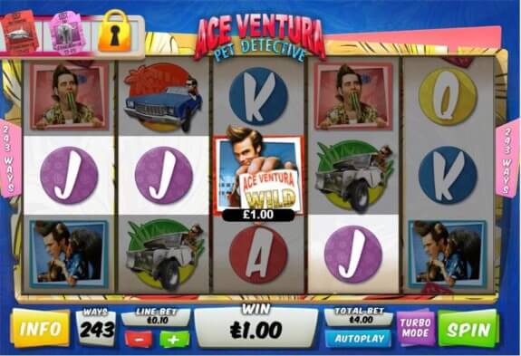 Ace Ventura Pet Detective är en spelautomat med fem hjul, tre rader och hela 243 vinstsätt. Eftersom spelet har 243 vinstsätt kommer du att ha stor kontroll över dina satsningar. Du justerar din insats genom att välja myntvärde där minsta värde du kan spela för är 0,01 och högsta är 0,4. Minsta insats i svenska SEK som du kan spela för är 2 SEK och högsta är 200 SEK. Antal mynt per vinstlinje är max 1 mynt. Högsta vinsten är 200 gånger insatsen när du får fem stycken symboler med Ace Venturas polisbricka. Du kan med andra ord kan vinna riktigt stort i denna spelautomat.