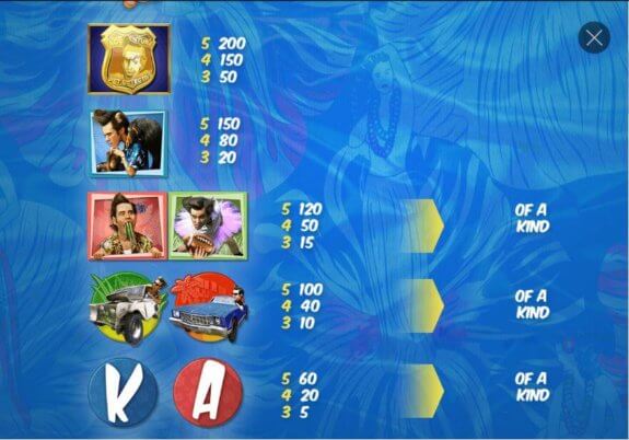 Ace Ventura videoslot är mestadels baserad på den första filmen, men har även en del från uppföljaren. Symbolerna följer temat och föreställer spelkort, djur, Ace Ventura i ballerinakjol, Ace Ventura som avlusar en apa och andra tokigheter. Specialsymboler är Ace Ventura med ett visitkort som är wild-symbol samt noshörningens bakdel som är scatter-symbol. Spelet levererar förstklassig underhållning med massor av humor och ibland får man även höra Ace Ventura vråla något klassiskt från filmerna.