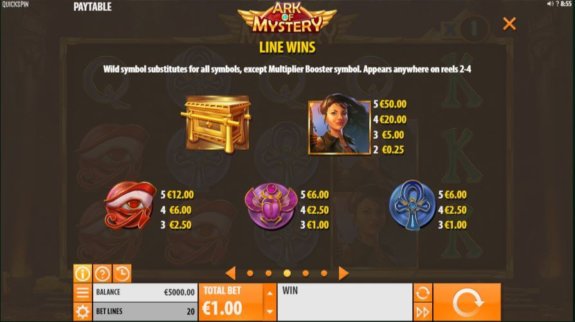 Ark of Mysterys tekniska detaljer består av fem hjul med tre stycken rader som symbolerna snurrar fram på. Spelet har 20 stycken fasta vinstlinjer som vinnande kombinationer skapas på. Att vinstlinjerna är fasta betyder att du inte kan justera dessa under spelets gång och du kan inte justera din insats med hjälp av dessa heller. I Quickspins spel är det enkelt att ändra sin insats! Du behöver inte hålla på och ställa in olika värden på olika knappar utan man klickar helt enkelt på pilarna vid “total insats”. I Ark of Mystery är den minsta totala insatsen du kan snurra hjulen för 2 SEK och den allra högsta är 1 000 SEK.