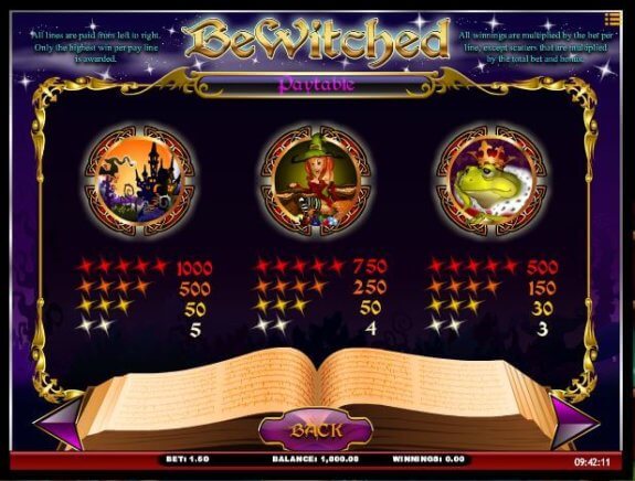 Det finns fyra lägre utbetalande symboler i Bewitched, som ser ut som förtrollade bokstäver. Även fast deras design är imponerande, så är de allra viktigaste symbolerna de som har högre värde. De är alla skapade med bilder av magiska föremål, som till exempel en kristallkula och häxans skor. Det finns också ytterligare ett par symboler, och det är de som ger den allra största utdelningen. Dessa är; grodkungen, den vackra häxan och det magiska slottet. Slottet är spelets absolut högst värda symbol, så se till att hålla utkik efter den!