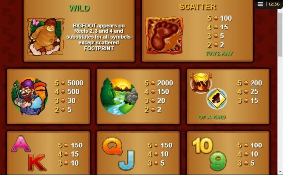 Fortsätt att följa Bigfoots fotspår längs skogen, och om du hittar åtminstone tre av dessa symboler på hjulen, blir du belönad med free spins.