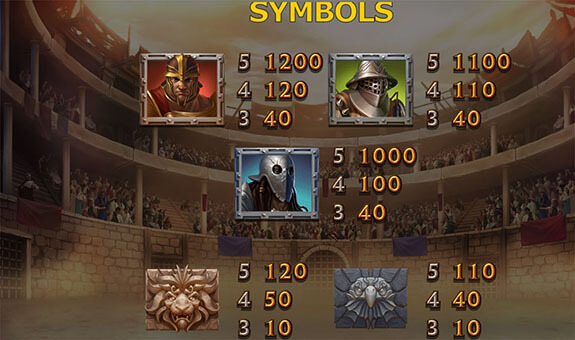 På hjulen kommer du mest att stöta på symboler som lågvärda metall-, brons-, silver- och guldmynt och 3 djur med medelvärde (lejon, tjur och örn) som huggits i sten. Du ser också 3 gladiatorer i röda, gröna och blåa färger, som representerar de premier som erbjuds i Champions of Rome. Den röda gladiatorn är den mest givande som ger dig 2, 6 eller 60 gånger din insats för 3, 4 eller 5 på en vinstlinje. Det finns också en wild som ersätter alla vanliga symboler, och även en “Beast”-symbol som är tillgänglig i free spins-funktionen, om du träffar Beast med ditt vapen så får du en extra free spin.