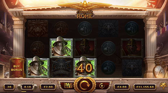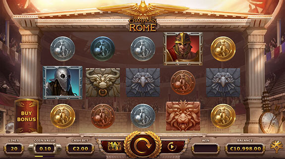 Champions of Rome är en videslot med 5-hjul och 20 vinstlinjer från Yggdrasil som kan spelas på alla enheter, inklusive iOS och Android, där insatsen är 0,20 till 100 euro. Med ett gammalt romerskt tema som involverar gladiatorer tillkommer det bonusfunktioner, inklusive Gladiator-funktionen där de 3 gladiatorerna lägger till 4 wilds på hjulen. Detta gäller även i free spins-funktionen där du väljer mellan 2 lägen: Training (du får 8 gratis spins där du behåller det du tjänat) eller Deathmatch Mode (du kan vinna med en multiplikator upp till 4x, om du vinner en viss summa kommer du att behålla alla vinster, annars så förlorar du din insats, vinst och multiplikator).