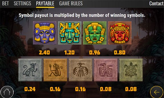 Contact Slot har en RTP som ligger på 96 procent och en väldigt hög volatilitet, det är alltså höga vinster som kan kammas hem här. Du kan vinna så mycket som 151 750 euro på ett snurr, vilket inte är illa alls. När det kommer till spelautomatens symboler så finns det inga specialsymboler utan endast standardsymboler. Det finns fem symboler som ger lägre vinst och de kommer i form av grottmålningar föreställandes olika djur. Det finns vidare fyra stycken symboler som betalar lite högre och de föreställer masker i olika färger. Den som ger absolut mest i vinst är masken i lila och guld.