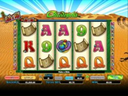 Raderna på den här spelautomaten ser ut att ligga framför en stor öken. Du hittar många olika alternativ under raderna, och det som ligger längst till höger är Spin-knappen. Om du fortsätter åt vänster kan du hitta Gamble-knappen och sedan knappar markerade med + och – för att bestämma myntens värde.