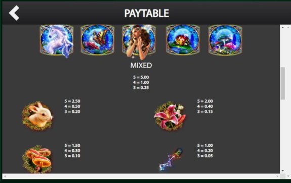 Betalningstabellen gör att du får en fin överblick över alla symboler. De som är värda minst är en krans, en flaska, en lykta och ett trollspö. Det finns tre symboler med högt utbetalningsvärde och de representeras av en kanin, en blomma och en flugsvamp. Men spelet har också fler blandade symboler som kan dyka upp på raderna – en älva, en enhörning, en fjäril, en nyckelpiga och en svamp bland annat. Slutligen finns det olika symboler för Wild och Jackpot också.