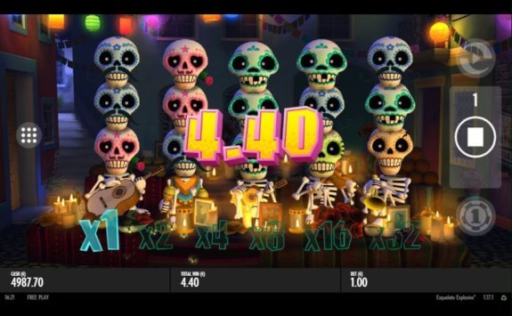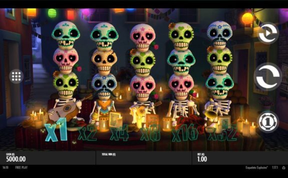 Allhelgonaafton i Mexiko är ett brett tema som applicerats på detta spel. För att nischa spelet har det fokuserat på explosive skelett. När du befinner dig framför spelplanen kommer du snart upptäcka alla fyrverkerier i bakgrunden, som följs åt av mariachi-band och en mycket festlig atmosfär. Snurra på hjulen och möt alla färgglada skelett som banar väg mot dig – några av dem sitter på ovärderliga priser.