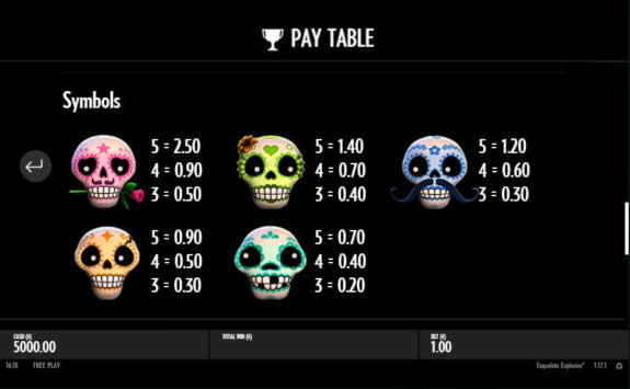 Låt oss ta en titt på alla funktioner och symboler som Esqueleto Explosivo har att erbjuda.