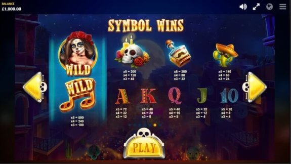 Hjulen i slotspelet ger dig en autentisk provsmakning av den mexikanska kulturen. När du öppnat spelet, kommer du att se att det utspelas vid en vägkant som bakgrund. Där finns det spelkort i valörerna A till 10 vid sidan av kaktusplantorna, flera kärl med tequila, och självklart också själva symbolen för ”Day of the Dead”; dödskallarna. Det finns också en mystisk kvinna som bär en mask, vilken representerar spelets wild-symbol. Hon ersätter alla andra symboler och erbjuder priser på 5, 12 eller 25 gånger din insats, i de fall som du landar 3, 4 eller 5 av henne på en och samma vinstlinje.