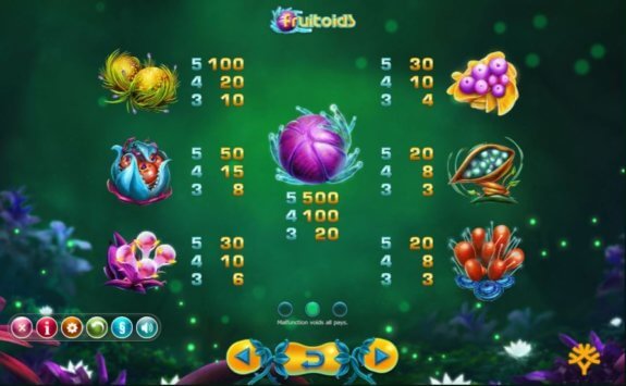 Det finns ingen uppdelning i höga och låga symboler i det här spelet, och det finns sammanlagt sju olika symboler förutom specialsymbolerna. Alla dessa är frukter som påminner oss om riktiga frukter, men so anpassats för att mer se ut som aliens. Vi pratar alltså om – fruitoids.