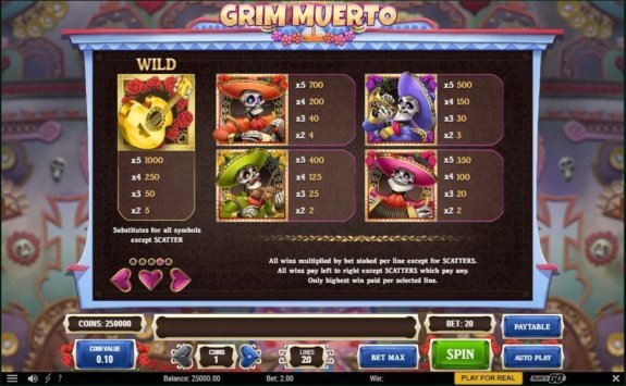 Grim Muerto spelautomat är enkel att bemästra tack vare att alla kommandon visas tydligt på skärmen i lättolkade rutor. Det enda som är kvar att göra är att bestämma din satsning och värdet på dina mynt, och trycka på Spin-knappen för att sätta igång allt det roliga.
