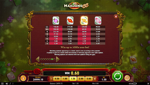 Mahjong 88 är en videslot som har så mycket som 8 hjul och 8 rader, men det är inte hjul som snurrar. Om du har spelat spelet Mahjong tidigare kommer du säkerligen känna igen mycket i den här sloten. Det finns inte några vinstlinjer att hålla reda på i Mahjong 88, istället vinner du genom att få kluster av samma symboler. Minst 4 symboler behöver du för att det ska ge utdelning, och för 12 eller fler i ett kluster vinner du högsta vinsten. Mahjong 88 har en RTP på 96 % och en hög volatilitet, det kan med andra ord gå lite längre mellan vinsterna men de är ofta stora.