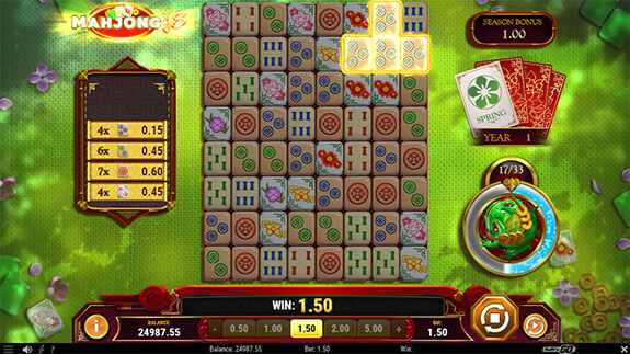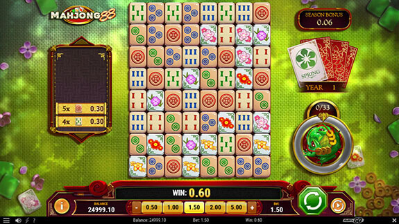 Vill du spela någonting som liknar Mahjong men som du kan vinna pengar på? Ta då en titt på Mahjong 88 från Play'n GO. Här stöter du på både specialfunktioner, olika typer av wilds samt säsongsbonus. Du spelar på en spelplan som är 8×8 i storlek och vinster betalas ut när du får kluster. När vinsten betalats ut försvinner klustrets och ersätts av nya symboler vilket kan ge dig fler vinster under samma spel.