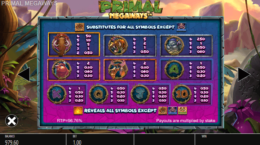 Primal Megaways är vackert utformad spelautomat som har en högklassig grafik. Symbolerna passar spelets tema väl. I spelet finner du totalt 14 stycken symboler. Spelets sex högutbetalande symboler består av fem uråldriga djurarter samt spelkortssymbolen A. De lågutbetalande symbolerna består av spelkortssymbolerna K, Q, J och 10. Det finns även fyra stycken speciella symboler i spelet, som triggar olika bonusfunktioner. Primal Megaways har en typisk utformning för Blueprint Gamings spel tillsammans med Big Time Gamings Megaways-funktion. Spelet har 6 hjul och totalt 46 656 stycken vinstsätt. Vinstsätten är något färre än i de flesta Megaways-spel, men detta vägs upp av att spelet har en RTP på 96,76 procent samt en hög volatilitet.