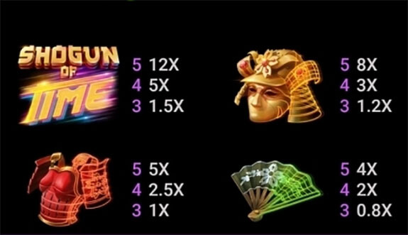 Att slotten har vinstvägar istället för linjer betyder att du inte behöver få symboler i ett visst mönster för att det ska bli vinst. Istället behöver du endast få symboler på hjul som ligger intill varandra, med start ifrån vänster. Något som är extra intressant när det kommer till spelets symboler är att de inte betalar ut ett bestämt myntvärde i samband med vinst. Istället delar de ut multiplikatorer av din insats. Om du till exempel får fem Shogun of Time-symboler belönas du med en multiplikator på x12. Det gyllene huvudet ger dig istället en multiplikator på x8. I spelinformationen hittar du all information om samtliga symboler.