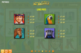 Med tanke på volatiliteten och spelets RTP kommer dina vinster inte att vara de högsta, men däremot kommer du att vinna oftare (fast mindre) än i en rad andra slots. När det gäller symboler fylls spelplanen dels av roliga djur med mänskliga drag och dels klassiska spelkortssymboler. Självklart dyker även Dr. Dolittle själv upp på planen då och då – han är dessutom den symbol som är värd mest i grundspelet. Spelkortssymbolerna från 10 till Ess är värda minst, vilket de oftast brukar vara. Utöver dessa symboler finns en del spännande bonussymboler som du kommer att få läsa mer om i nästa stycke.