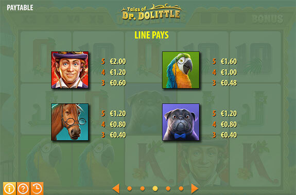 Med tanke på volatiliteten och spelets RTP kommer dina vinster inte att vara de högsta, men däremot kommer du att vinna oftare (fast mindre) än i en rad andra slots. När det gäller symboler fylls spelplanen dels av roliga djur med mänskliga drag och dels klassiska spelkortssymboler. Självklart dyker även Dr. Dolittle själv upp på planen då och då – han är dessutom den symbol som är värd mest i grundspelet. Spelkortssymbolerna från 10 till Ess är värda minst, vilket de oftast brukar vara. Utöver dessa symboler finns en del spännande bonussymboler som du kommer att få läsa mer om i nästa stycke.