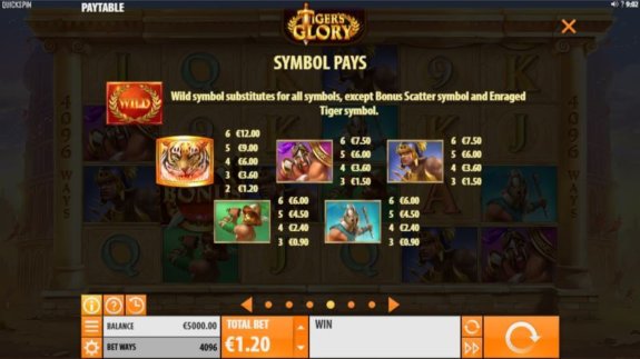 Spelet har elva olika symboler. Det är först de vanliga spelkortssymbolerna som har de lägre värdena. Sedan finns det symboler som föreställer fyra olika gladiatorer och givetvis en tiger. Tigern betalar ut tio gånger insatsen om den dyker upp på alla sex hjulen. Spelet har både wilds och scatters att bjuda på och där du kan få upp till 20 free spins i free spins-läget. Det finns även en specialsymbol i form av Enraged Tiger.
