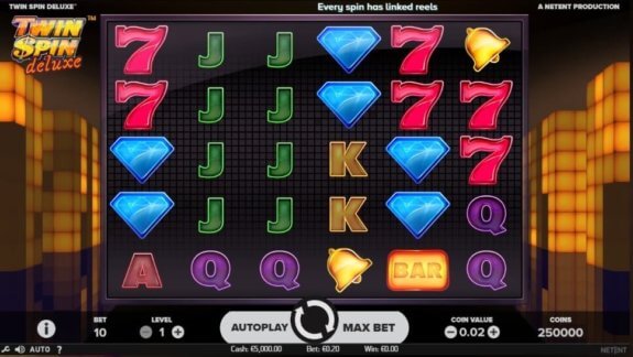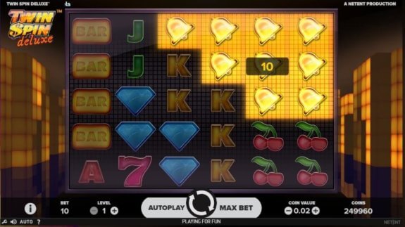 Twin Spin Deluxe är ett spel utvecklat av välkända NetEnt, vilket i princip garanterar en strålande spelupplevelse. Det är sällan NetEnt lanserar spel som blir en flopp, då denna spelutvecklare står för kvalitet. Vad är det då som får Twin Spin Deluxe att sticka ut lite extra? Dels är det ett spel med utmärkt grafik och dels kan du snurra hem en massiv vinst på otroliga 100 000 mynt, trots att spelet inte har en progressiv jackpott.