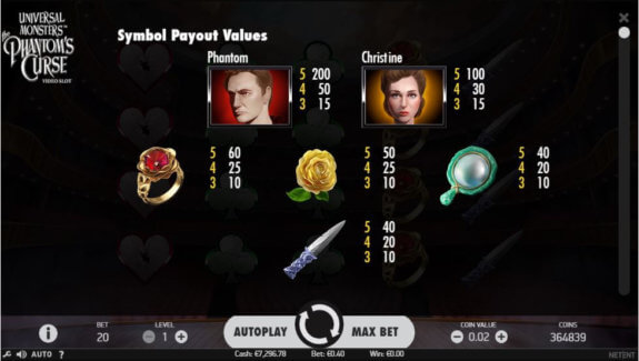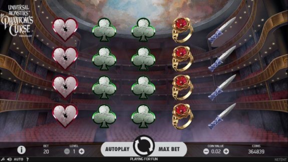 Universal Monsters: The Phantom’s Curse är en videoslot som skapats av NetEnt, vilken man bör vara väldigt stolt över. Det har 40 vinstlinjer, en layout på 5 hjul i 4 rader, med vilket du kan beräkna dina vinster.