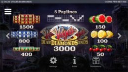 Vegas Diamonds är en slot med Las Vegas-tema med tre hjul, tre rader och fem olika vinstlinjer. Här får du som spelare välja mellan ett brett spann av insatser, vilket innebär att spelet passar bra både för nybörjare och för den erfarne spelaren som gärna satsar lite högre summor. Du justerar snabbt din insats genom att trycka på mynt-symbolen till vänster om spelplanen. Det går dock inte att välja myntvärde eller justera vinstlinjerna. Istället får du välja hur mycket din totala insats ska vara. Du satsar alltid 100 mynt per snurr. Den minsta valbara insatsen är 2 SEK och den högsta är 1 000 SEK.
