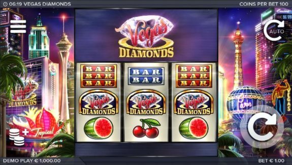 Spelet har klassiska symboler som ger en retrokänsla. Här fylls hjulen av symboler som citroner, vattenmeloner, körsbär och olika bars. Vegas Diamonds-sloten utspelas alltså i Las Vegas där du kommer få se den världsberömda stripen i bakgrunden och många ikoniska byggnader medans du snurrar på hjulen. Funktionerna i spelet kommer ge dig olika slags fördelar. Håll bland annat utkik efter identiska symboler på två av hjulen då detta kan utlösa en re-spin-funktion. Vad det gäller grafiken finns det inte mycket att klaga på. Spelet beskrivs bäst som en retroslot fylld med dagens moderna specialfunktioner. Läs mer om dessa i stycket under!