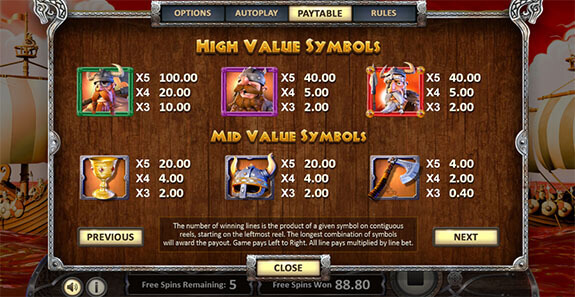 Free spins aktiveras automatiskt om du lyckas få ett vikingaskepp på hjul 1 och 5. Denna funktion kan dessutom återaktiveras under själva bonusläget. Även Odins egen korp kan ta dig närmare vinsterna i denna roliga slot. Något bonusspel hittar du inte i denna slot, men det är inte hela världen – den är underhållande ändå.