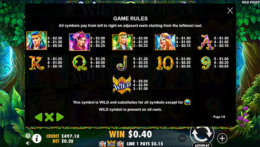 Vinster i Wild Pixies räknas från vänster till höger och för att kamma hem en vinst ska du landa minst tre stycken likadana symboler i en vinstlinje. Symbolerna med lägst värde är klassiska kortsymboler (A, K, Q, J, 10 och 9). För att komma åt lite högre vinster finns det fyra symboler som är utformade som älvor av manliga och kvinnliga kön. Den manliga symbolen med blått hår är värd mest. Du får mellan 500 och 2 500 mynt när du landar tre, fyra eller fem sådana symboler. I spelet finns det även ett par specialsymboler som vi kommer till lite längre ner.